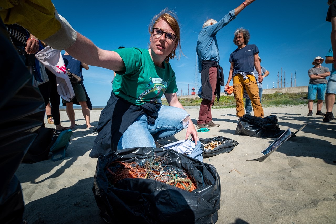 De aftrap voor de Clean-up Week werd gedaan in Harlingen. Voor vertrek naar de Tall Ships Races in Antwerpen werd het strand schoongemaakt. Hester Ozinga deed mee: ‘Als freelancer in media en PR help ik Bark EUROPA vaak op momenten als ze in Nederland zijn. De beach clean-up leek mij een mooie manier om meer te weten te komen over de lopende onderzoeksprojecten. Karl Beerenfenger en Regitze Andersen van Nordic Ocean Watch gaven een toelichting over hun werk, daarna gingen we op pad. Gewapend met herbruikbare jutassen van het project Jut en de Clean-up Bingokaart gingen we op pad. Op het moment dat we dachten dat het strand wel schoon was, of er al anderen op ons stukje strand waren geweest, ontdekten we dat we veel beter moesten kijken. Want op je hurken in het zand en met je neus vlak boven het strand zie je pas hoe veel hele kleine plastic draadjes en bolletjes er overal liggen. En sigarettenpeuken en doppen en andere klein spul wat daar niet hoort. In drie kwartier tijd verzamelden we samen met de onderzoekers en voyage crew bijna 14 kilo afval! Best heel veel voor een relatief klein stukje strand.